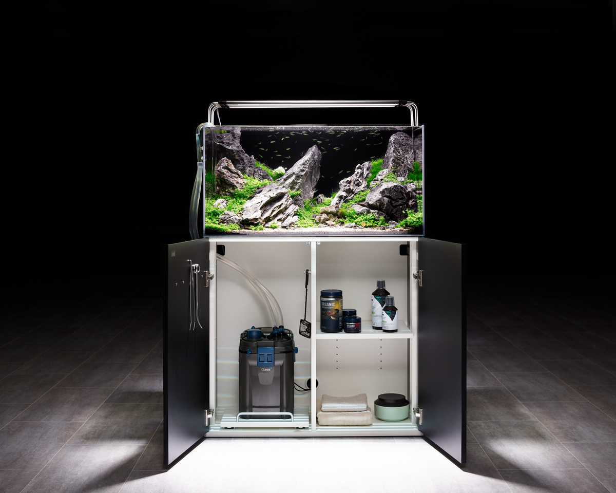 El paisajismo acuático es una rama de la acuariofilia vegetal particularmente apasionante. El acuario se diseña siguiendo criterios específicos para crear una atmósfera única y fascinante. Los elegantes muebles y acuarios de diseño de los sets ScaperLine proporcionan el entorno perfecto para el carácter artístico de su acuario: las puertas sin tiradores con función Push-to-open, el innovador guiado de cables y el portaherramientas magnético en la puerta del amplio mueble aseguran un aspecto limpio y ordenado. Los bordes cortados en inglete crean límites limpios y sutiles, dando a su acuario Scape una apariencia casi flotante. Para una visualización incomparable del interior de su Scape, el cristal Whiteglass ofrece una visión clara y una reproducción natural del color, sin molestos tonos verdosos. Nuestro set de 250 litros, con sus dimensiones de 100 × 50 cm, proporciona un amplio espacio para crear diseños sumergidos extraordinarios